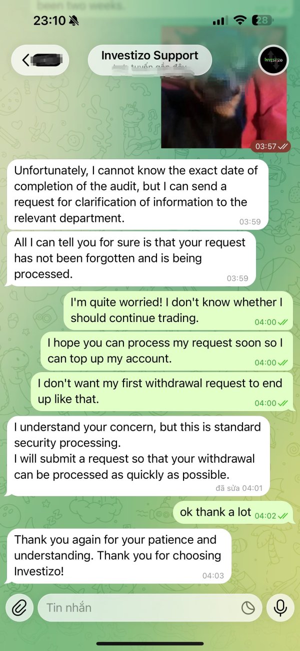 investizo 7 530.00 đã được xử lý và không thể rút tiền mặt Xin chào Tôi là Dao Anh Tung . các bạn đã quá 7 ngày trong điều luật 6.3 of the “TERMS OF USE” of the Company . Bởi vì từ ngày tôi rút là 19/03 hiện tại đã là ngày 31/3 . Các bạn sẽ phải trả tiền cho tôi rừ ngày 26/03 nhưng tôi đã không nhận được phản hồi , cũng không có tiền . Luật của các bạn . Nhưng các bạn không tôn trọng chính luật mà bạn đề ra . Các bạn cũng không giải thích với chúng tôi 1 câu nào . và sự chậm trễ này đã kéo dài 5 ngày sàn này khả năng không có tiền thanh khoản ! họ cứ hứa hẹn là tiền sẽ chuyện cho tôi nhưng không chuyển ! đây là một sàn lừa đảo lớn ! hệ thông hỗ trợ của họ cực kì tệ hại tôi khuyến nghị không nên nạp tiền vào đây ! khách hàng việt nam cũng không nên nạp tiền tôi thấy sàn này giống sàn ăn cháy