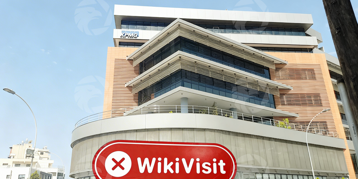 Die Ermittler kamen am 13. August 2023 zum KPMG-Zentrum in Agias Fylaxeos 1 in Limassol. Das moderne Geschäftsgebäude liegt an einer wohlhabenden Straße und verfügt über eine einfache und modische Fassade aus französischen Fenstern und Steinen. In der Ferne ist das auffällige Logo des KPMC Center deutlich zu erkennen.