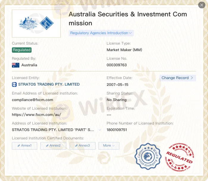- Australia (ASIC): License No. 309763 under Stratos Trading Pty. Limited. FXCM operates as a Market Maker and adheres to client fund segregation and financial disclosure.