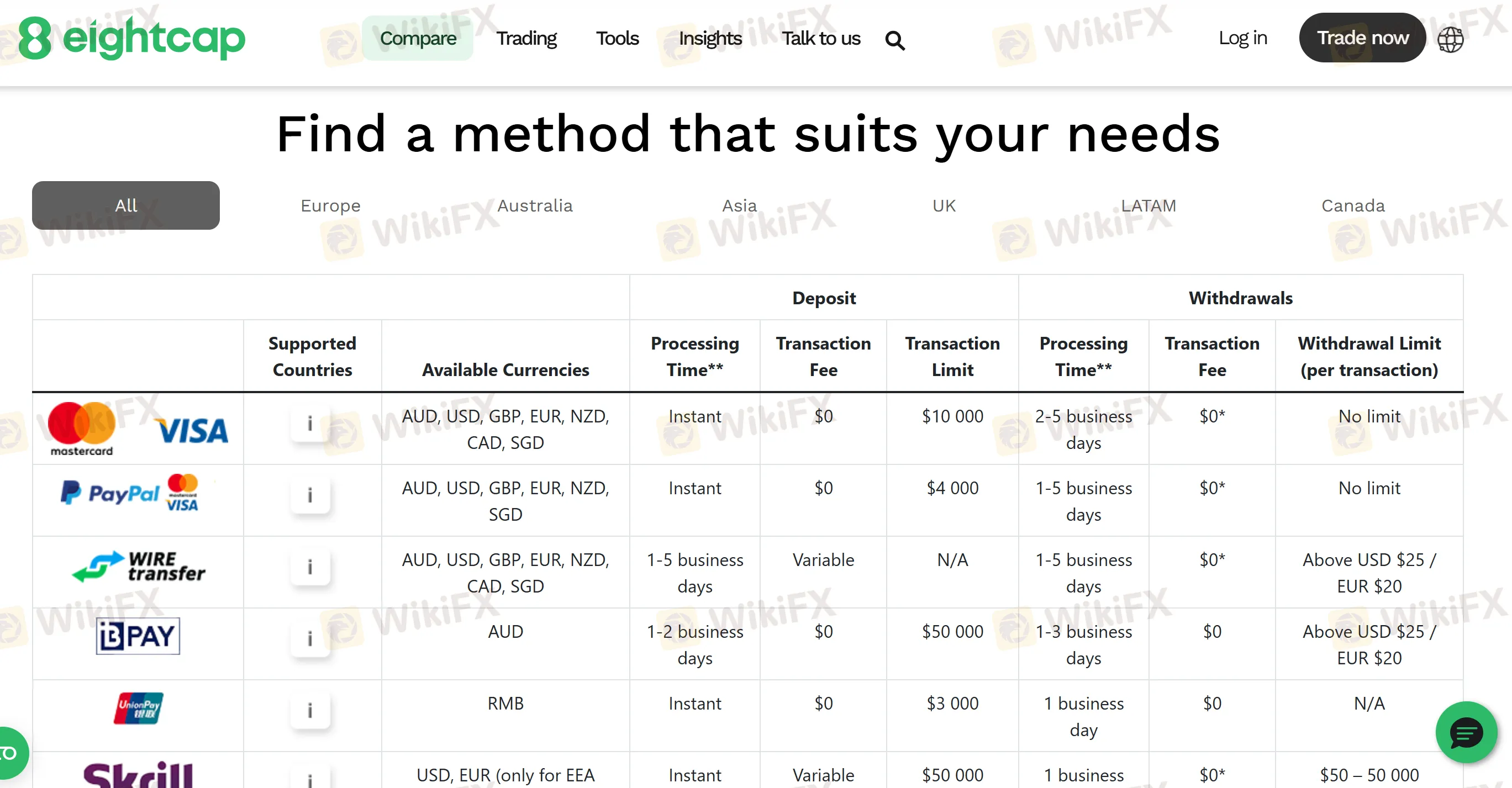 Eightcap does not charge internal fees for most methods in the matrix. However, channel fees (card schemes, e-wallets, banks, FX conversions) may apply.
