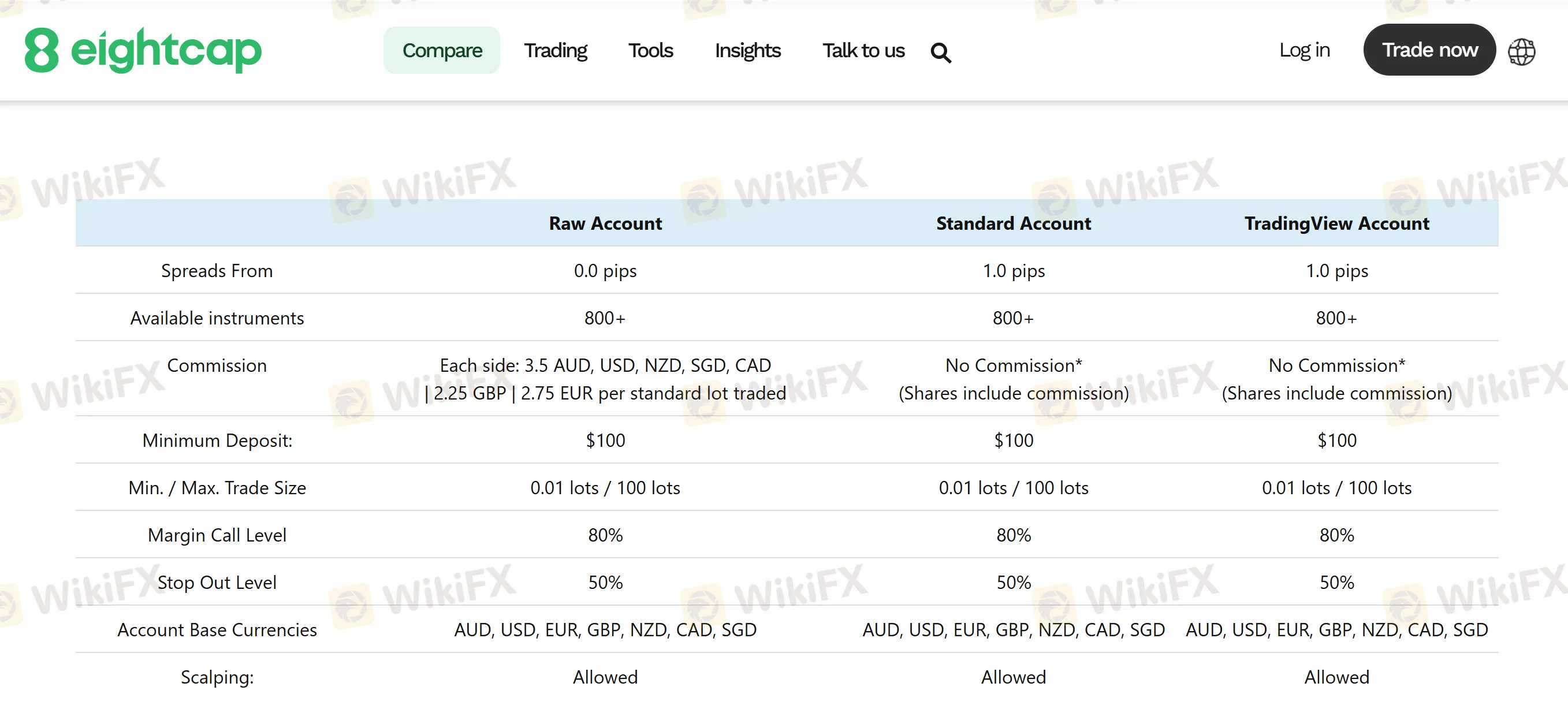 Eightcap notes no broker fees on FX/CFD products beyond the pricing model; overnight financing may apply to held positions.