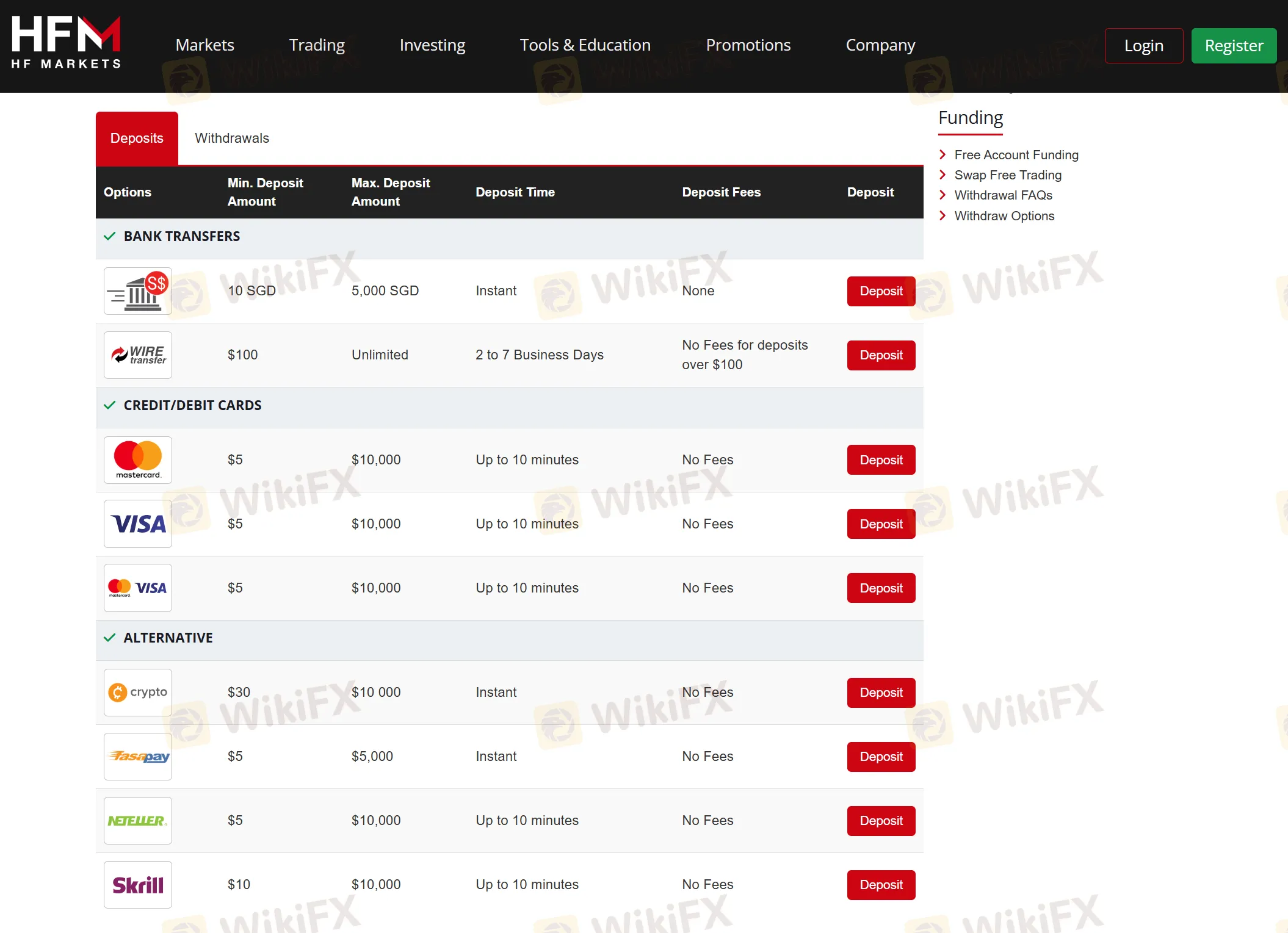 HFM lists bank transfer, cards, and several alternative e-wallet/processors. HFM states no deposit fees (provider/bank charges may apply). Card/alt methods are typically instant or <10 min; bank wires show $100 min and 2–7 business days for deposits.