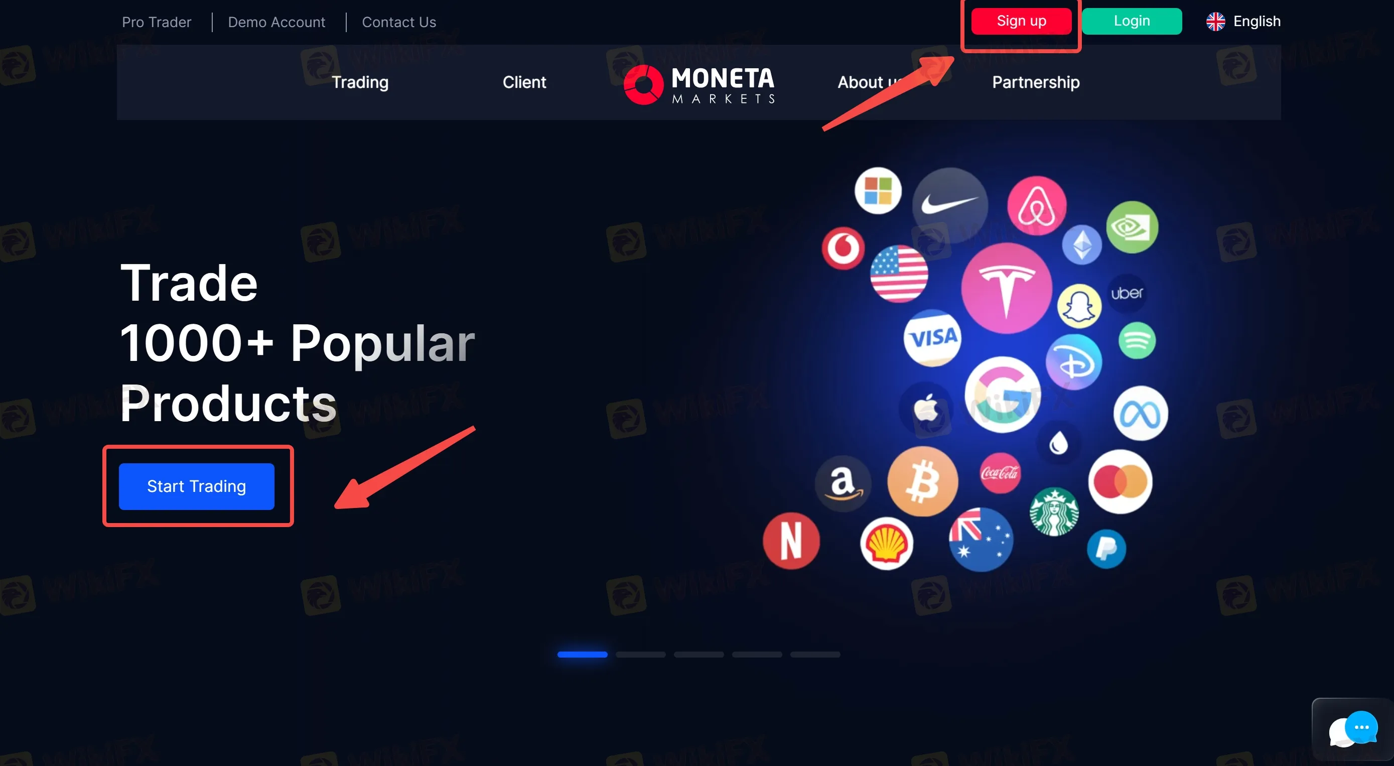 Use the Client Portal (myaccount.monetamarkets.com) to manage funds, then log in to your chosen platform (MT4/MT5/PRO Trader/WebTrader).