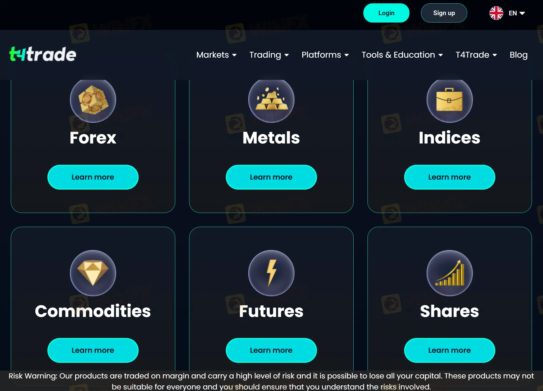 Notes: The homepage/markets sections list forex, metals, indices, commodities, futures, shares. T4Trades content library discusses crypto-CFDs conceptually; actual availability can be jurisdiction-dependent—confirm in the client portal before funding.
