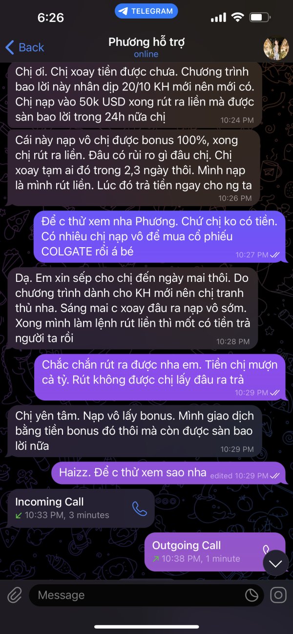 IB ban đầu giới thiệu các chương trình khuyến mãi về bonus và phí để mình nạp tiền, theo đó IB nói là nạo lấy bonus và được tham gia bao lời trong 24h nên chắc chắn ko lỗ. Tuy nhiên sau khi lời mấy lệnh đầu, lệnh sau bị lỗ vs số lot lớn. Hỏi lại IB thì báo là khi đạt tỷ lệ lời là hết chương trình, tuy nhiên lúc hết mà không báo nên âm luôn qua phần vốn nạp vô. Sau đó IB báo nạp tiền vô bằng số tiền đang âm thì chắc chắn gỡ được. Cam kết là sẽ được nhưng nạp vô từng nào âm từng đó. IB cứ cắt 1 đầu. Đến khi âm gần hết thì mới cân lệnh. Số lượng lệnh thì rất nhiều. Mỗi mã 3,4 lệnh. Mỗi lệnh đến 100 lot. Với số lượng lớn như vậy chắc chắn cháy tk vì không phù hợp với vốn. Tôi đã báo với IB rằng tôi mới chơi, chưa quen với thị trường và IB đã dẫn dắt tôi cháy tài khoản. Còn khuyến khích tôi vay mượn để bỏ vào gồng lệnh. Đến khi không vay được thì hù rút bonus cho cháy tk luôn!!!! Nên tránh xa IB và sàn cố tính đánh cháy tk KH như vậy