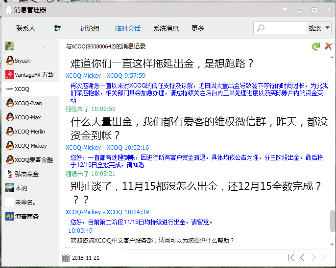 爱客金融拖延出金超一个月,疑似为跑拖时间!!!平台称分三阶段清盘出金,分别10月15,11月15,12月15,直到今天11月21也没有多少个客户能到帐的。