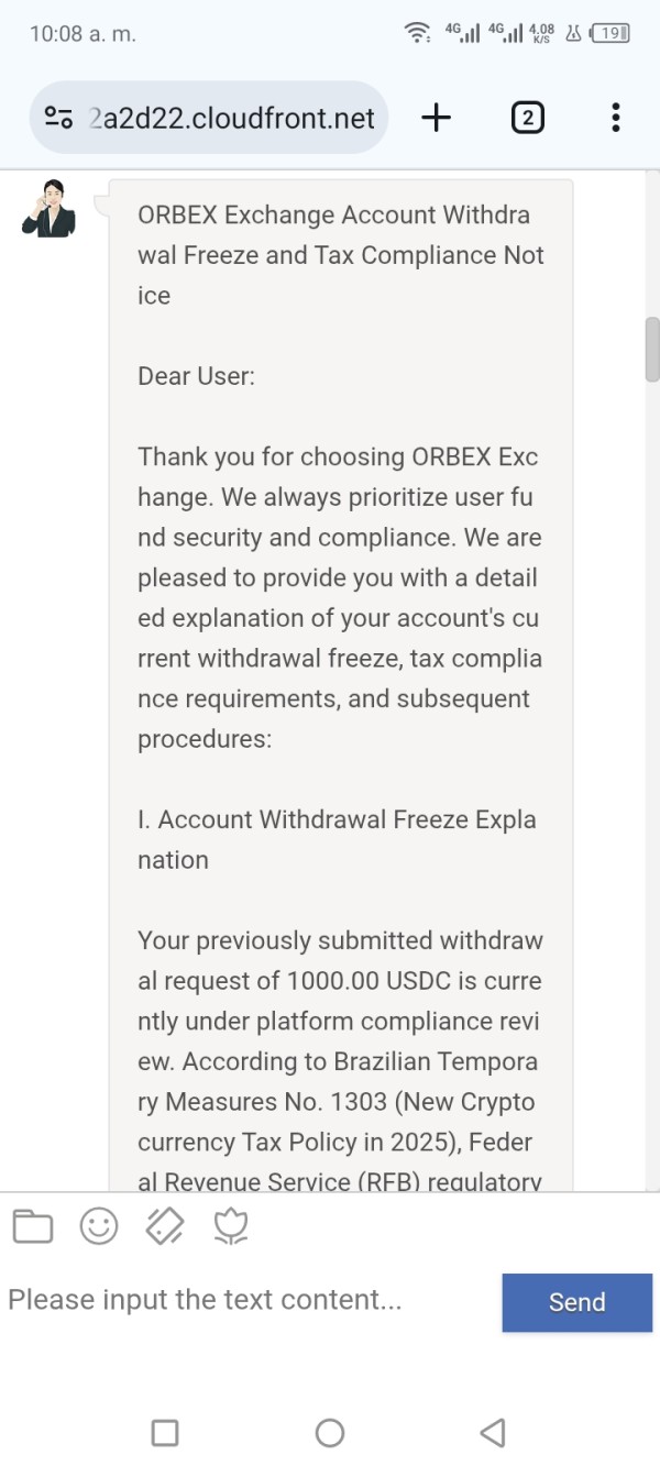 Hola... Quise realizar mi primer retiro de mi cuenta Orbex, por una cantidad de 1000$. Y hasta la fecha no me a llegado el dinero a mi cuenta de Binance. Y escribi a atención al cliente, y ahora me dice que mi cuenta está congelada y debo pagar aproximadamente 4000$ de impuestos!