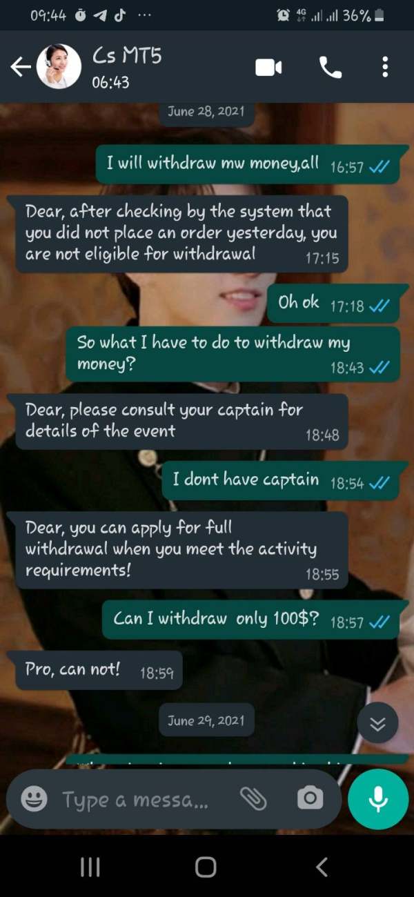 awalnya semua berjalan lancar, recharge or withdraw lancar,. sampai tgl 28 juni 2021 saya ingin withdraw dan saya tidak bs, cs menjelaskan bahqa saya tidak ada transaksi sebelumnya, dan saya harus trading dlu malam sebelum withdraw, akhirnya 29 juni 2021 malam saya trading dan keesokan harinya saya bertanya ke CS dan CS bilang saya tidak eligible untuk withdraw karena even blm berakhir, padahal saya tidak pernah ikut even apapun atau diundang untuk even apapun tidak ada. s