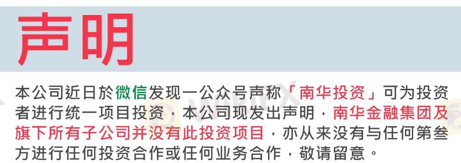 本公司近日於微信发现一公众号声称「南华投资」可为投资者进行统一项目投资,本公司现发出声明,南华金融集团及旗下所有子公司并没有此投资项目,亦从来没有与任何第叁方进行任何投资合作或任何业务合作,敬请留意。