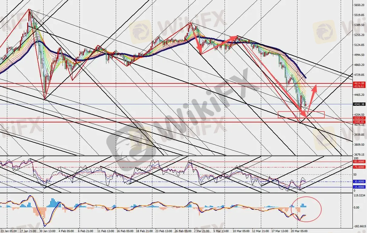 黄金H4级别超跌反弹,MACD双线和量能柱在零轴下方缩量。特朗普宣布暂停打击行动后,市场风险偏好快速提升,投资者对中东能源供应中断的担忧暂时缓解。此前高油价环境下,全球央行集体维持紧缩路径压制了黄金估值,现在缓和信号为政策转向打开空间。