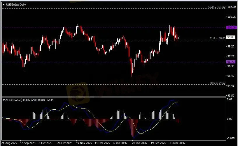 日线图显示美元指数震荡走弱,当前测试98.80支撑。从MACD来看,快慢线形成死叉,红色动能柱温和放量。指数走势基本和动能柱的变化一致。