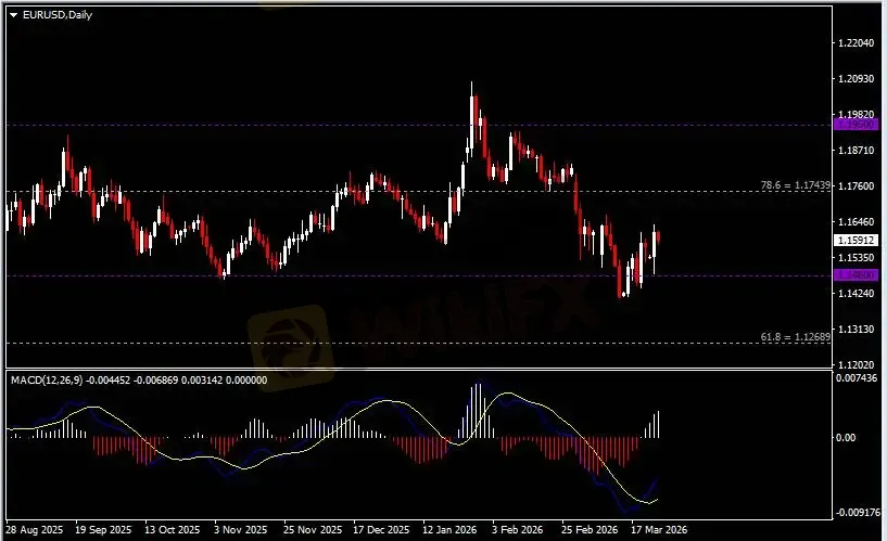 日线图显示美元兑日元高位回调,当前承压于158.90阻力。从MACD来看,快慢线拐向下行,红色动能柱温和放量。汇价走势基本和动能柱的变化一致。
