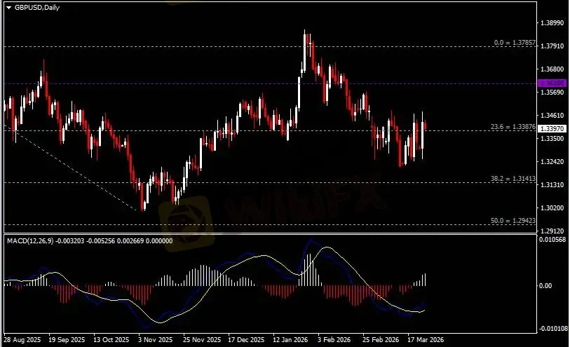 日线图显示英镑兑美元强势反弹,当前收于前高1.3390。从MACD来看,快慢线拐向上行,白色动能柱温和放量。汇价走势基本和动能柱的变化一致。