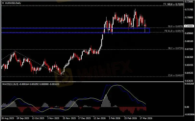 日线图显示澳元兑美元持稳于0.6920-0.6970支撑区域。从MACD来看,快慢线向下运行,红色动能柱温和放量。汇价走势和动能柱的变化呈分歧。