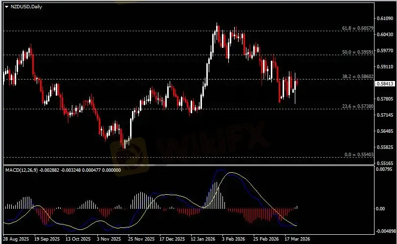 日线图显示纽元兑美元反弹上涨,当前测试0.5860阻力。从MACD来看,快慢线形成金叉,白色动能柱温和放量。汇价走势基本和动能柱的变化一致。