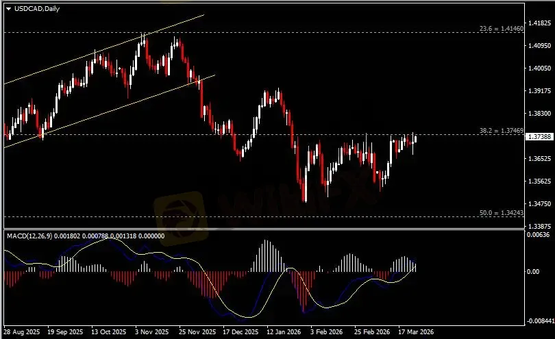 日线图显示美元兑加元回测1.3750阻力。从MACD来看,快慢线向上运行,白色动能柱则温和收缩。汇价走势和动能柱的变化稍显分歧。