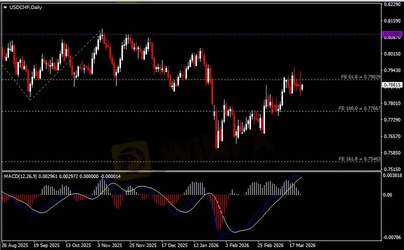 日线图显示美元兑瑞郎回调下挫,当前承压于0.79关键阻力。从MACD来看,快慢线欲形成死叉,白色动能柱温和收缩。汇价走势基本和动能柱的变化一致。