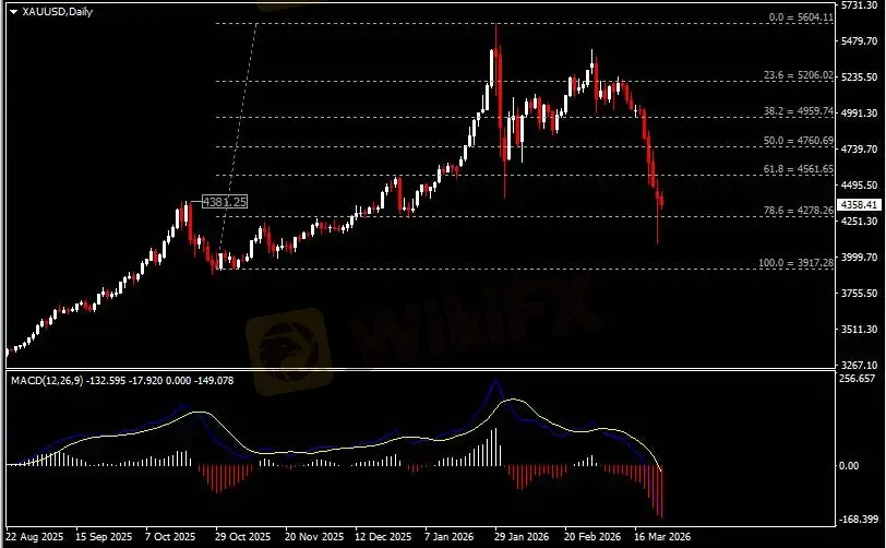 日线图显示金价扩大颓势,当前测试4280支撑。从MACD来看,快慢线向下运行,红色动能柱持续放量。金价走势基本和动能柱的变化一致。
