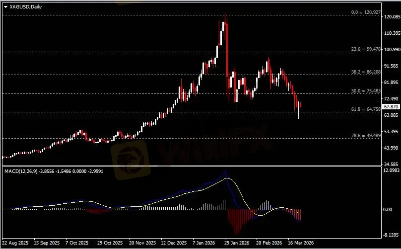 日线图显示银价低位反弹,当前收于64.80支撑。从MACD来看,快慢线向下运行,红色动能柱温和放量。银价走势和动能柱的变化呈分歧。