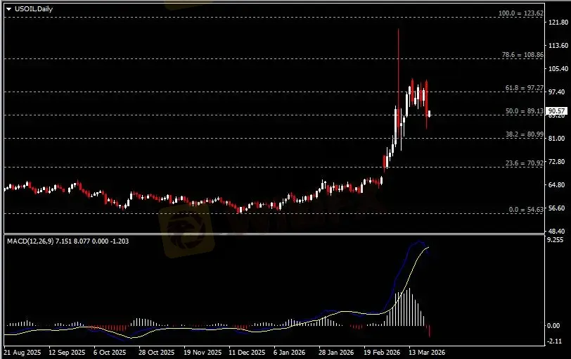 日线图显示油价回调下挫,当前承压于97.30阻力。从MACD来看,快慢线形成死叉,红色动能柱温和放量。油价走势基本和动能柱的变化一致。