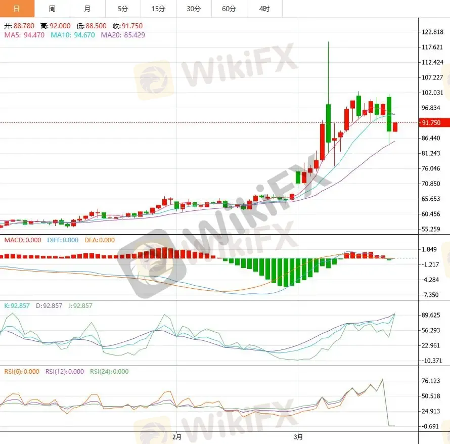 日线结构显示,油价关键支撑位位于 85 美元附近,若跌破则可能进一步下探至 80 美元区域;上方阻力集中在 95 美元一线。日线级别 RSI 已从超买区域快速回落,多头动能显著减弱。4 小时级别上,油价呈现典型的“瀑布式下跌”结构,短期均线系统出现死叉,MACD 指标在零轴下方扩大,短期下行风险仍存。
