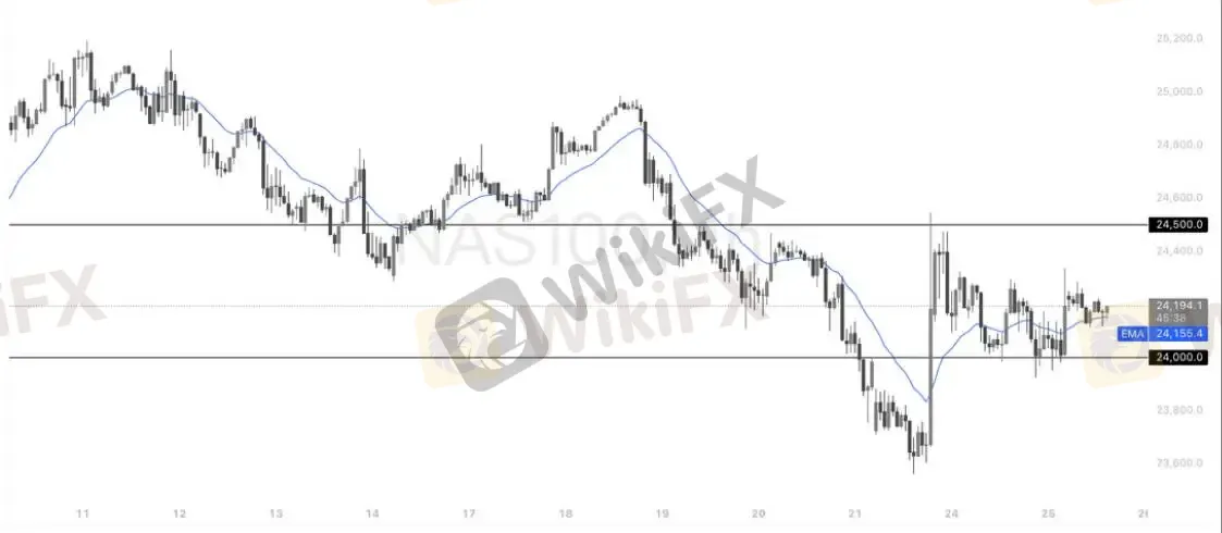 纳指 100 在经历前期快速下探后,当前处于低位震荡修复阶段,价格站稳 20 小时均线(EMA20)上方,短期多头情绪有所修复。核心支撑位在24000点,若回踩不破则有望延续反弹;上方阻力位为24500点,需突破该位置才能打开进一步上行空间。