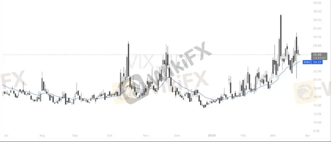 VIX 恐慌指数当前报 25.86,已站稳 20 日均线(24.27)上方,相较于 2026 年初 12 附近的极端低位,市场波动中枢已实现翻倍式抬升,期间多次冲高至 30 关口上方、最高触及 36 附近的高位,反映出美股市场恐慌情绪已显著升温。本轮 VIX 持续上行,核心驱动来自中东地缘局势的反复拉锯、美股科技板块的分化调整与 AI 标的估值博弈,叠加宏观政策与企业盈利的不确定性,市场已彻底告别此前持续近半年的低波动行情,波动行情下关注板块轮动机会。