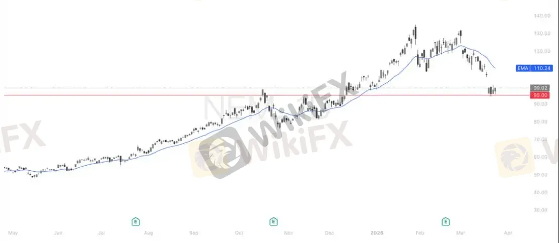 技术面上,NEM 经过充分回调后已进入高性价比布局区间,下方95美元位置构成强支撑,抛压显著衰竭。当前股价处于中期相对低位,远离历史估值上限,且明显跑输金价涨幅,存在强烈的补涨需求。随着金价持续走强、市场风险偏好回升,叠加机构资金回流黄金板块,NEM 有望突破短期均线压制,向上打开反弹空间。防守位置近日低点94美元。