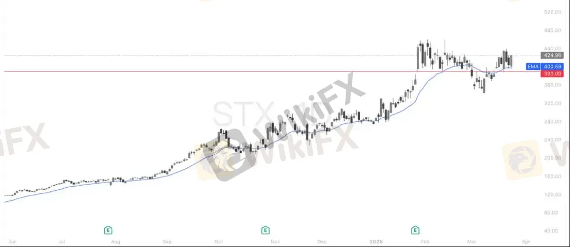 技术面来看,STX 长期处于明确的上升通道中,过去 12 个月股价累计涨幅达 310%,多头趋势强劲。当前股价 424.96 美元,稳稳站在 20 日均线(EMA20=400.59 美元)上方,均线持续拐头向上,形成有效短期支撑;下方核心强支撑位为 390 美元,是前期突破的关键平台位,只要该位置不有效跌破,中期上升趋势就不会改变。短期上方阻力位为前期高点 450 美元,一旦放量突破该位置,将确认新一轮上涨行情的开启,向 530 美元的目标价发起冲击,在盈利超预期的背景下,甚至有望挑战 700 美元的乐观预期。