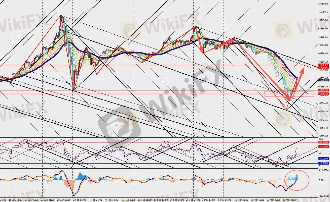 黄金4小时级别大幅上涨,MACD双线和量能柱在零轴附近扩张。第二季度黄金将面临压力,但到年底时,随着通胀得到控制,央行获得更大的政策自由度,美元可能走软,利率也可能下调,届时黄金的前景将再次变得乐观。