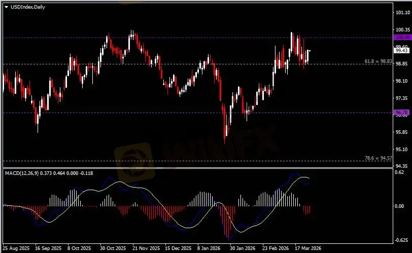 日线图显示美元指数企稳反弹,当前收于98.80支撑。从MACD来看,快慢线呈拐向,红色动能柱温和收缩。指数走势基本和动能柱的变化一致。