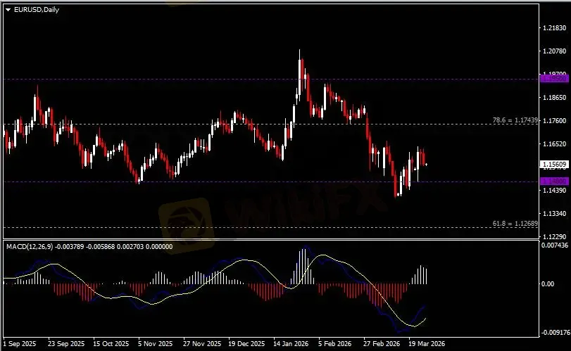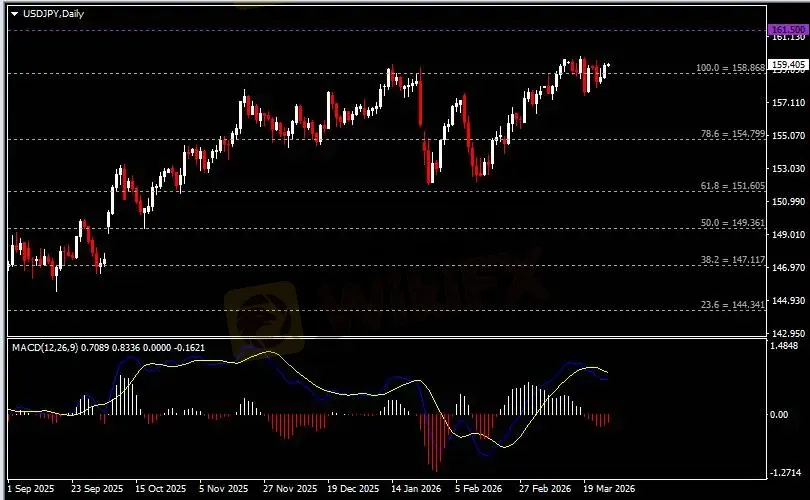 日线图显示美元兑日元震荡上行,当前收于前高158.90。从MACD来看,快慢线呈拐向,红色动能柱温和收缩。汇价走势基本和动能柱的变化一致。