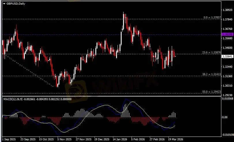 日线图显示英镑兑美元回调下挫,当前承压于前低1.3390。从MACD来看,快慢线向上运行,白色动能柱则温和收缩。汇价走势基本和动能柱的变化一致。