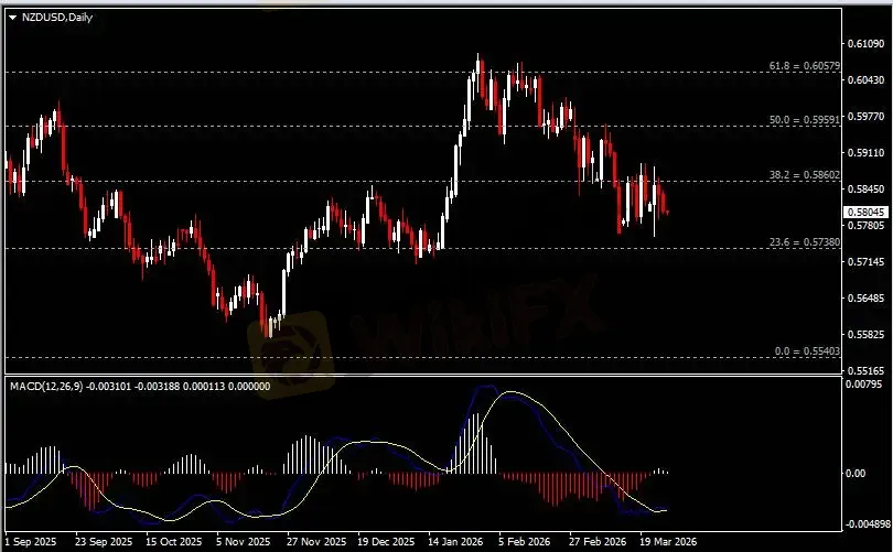 日线图显示纽元兑美元回调下跌,当前承压于0.5860阻力。从MACD来看,快慢线欲形成死叉,白色动能柱温和收缩。汇价走势基本和动能柱的变化一致。