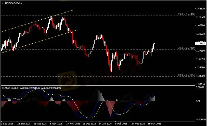 日线图显示美元兑加元震荡上行,当前收于前高1.3750。从MACD来看,快慢线向上运行,白色动能柱恢复放量。汇价走势基本和动能柱的变化一致。
