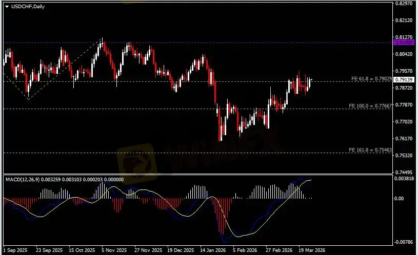 日线图显示美元兑瑞郎震荡上行,当前持续测试0.79关键阻力。从MACD来看,快慢线拐向上行,白色动能柱恢复增量。汇价走势基本和动能柱的变化一致。