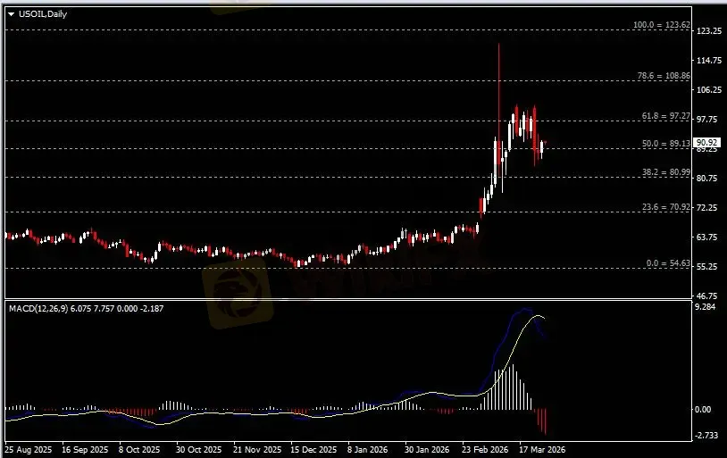 日线图显示油价企稳反弹,当前仍收于89关键支撑。从MACD来看,快慢线向下扩张,红色动能柱温和放量。油价走势和动能柱的变化呈分歧。