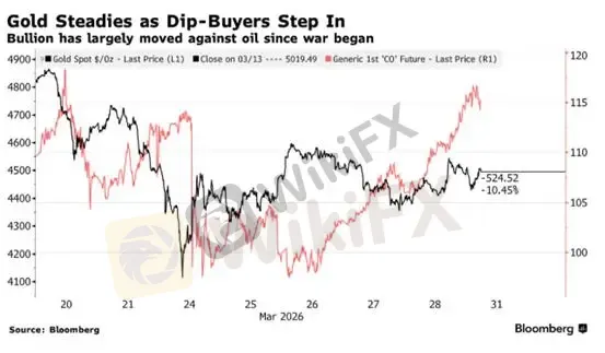 ATFX:随着伊朗战争进入第五周,周一亚市黄金价格略微高开后一度走低,随后在4500美元上方持稳。上周,自中东冲突爆发以来,黄金首次实现周线上涨,在经历了多年来最大规模的抛售之后,一些逢低买盘支撑了金价,市场也在等待冲突持续时间的明朗情况。