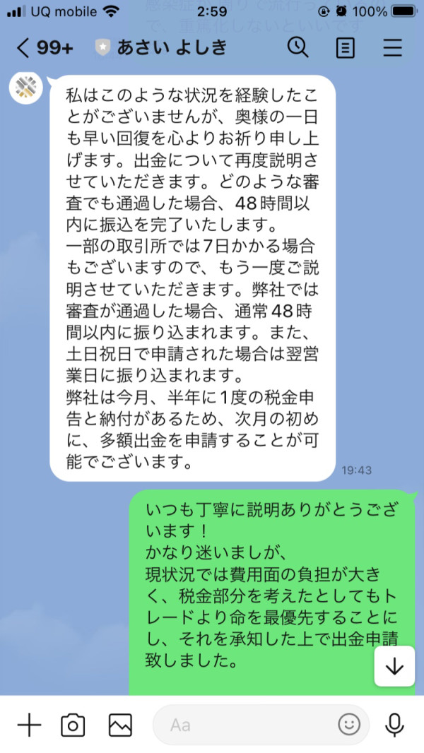 最初は、普通の投資グループらしい内容で、株式についてとか、日常的な話で会話が進んでいたが、利益率の話になり、そう考えるとFXが最適という結果になり、先生と言われる人の呼びかけもあって(バラバラの取引所だとlot数やレバレッジの統一を測るため言われ) 資金を移動して、紹介されたここを利用。結果も残せているので、数回にわたり入金したが、そろそろ出金したいと思い、手続きをすると、税金がかかるから、とか取引所の税金支払いがあるから、という理由で出金を控えてという連絡あり。でもお金が必要なので10万円分の出金手続きをすると、承認はされるが一向に口座に入金されない。Twitter等で調べると、同じ名前の先生で被害に遭った人がいるとの情報を見つけた。