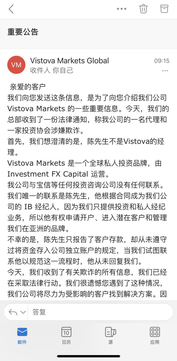 Vistova 发送了一份公报。陈先生和宝信集团是骗子。