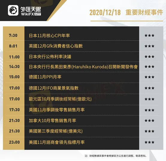 以下為12月18日(週五)重要財經事件,更多資訊,請關注外匯天眼APP或官方網站!