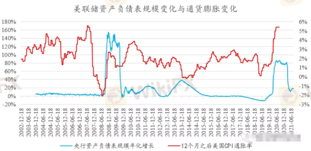 這個思路的確沒啥問題。可惜,現實卻很骨感,除了能看到央行資產負債表一直在增加、而通脹也一直持續這兩個共同點之外,你幾乎看不到通貨膨脹變化與央行資產負債表規模變化之間的關係。